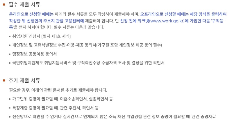 제출서류는 다음과 같습니다. 기본적으로 제출해야 하는 서류로는 1. 취업지원 신청서 2. 개인정보 동의서 3. 행정정보 공동이용 동의서 4. 국민취업지원제도 취업지원 서비스 및 구직촉진수당 수급자격 조사 및 결정을 위한 확인서입니다.